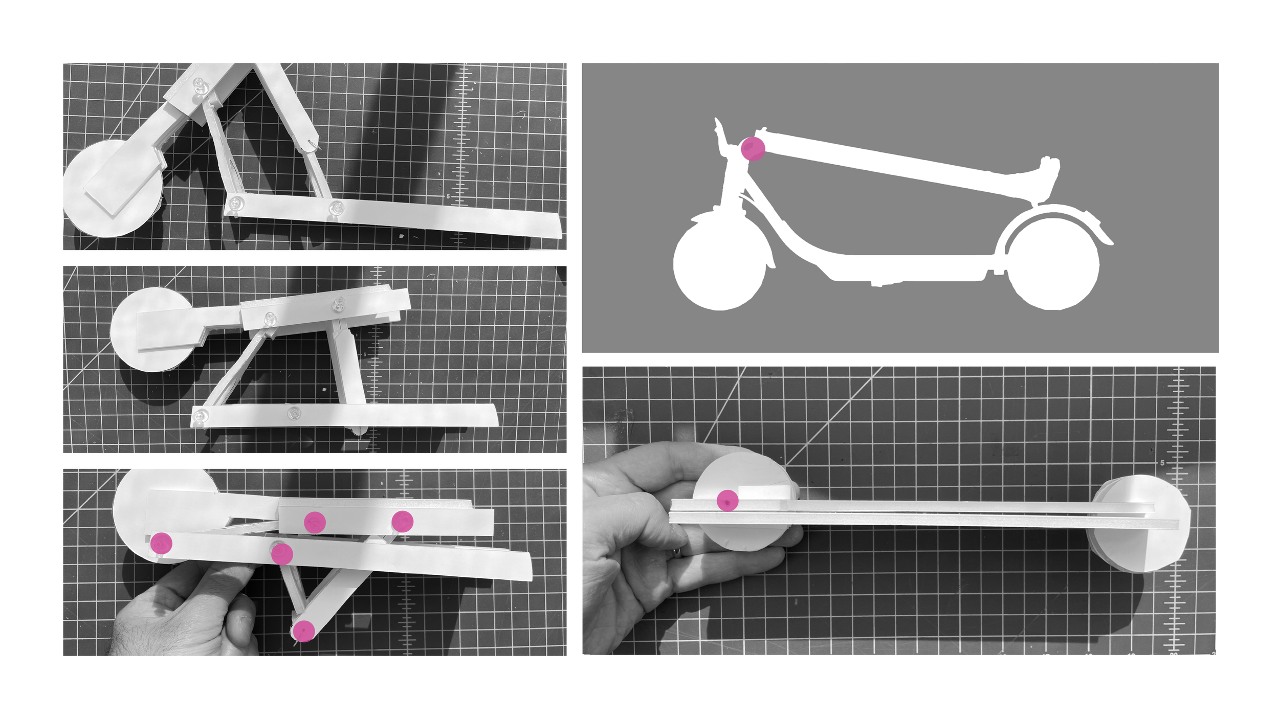 Sketching can only bring an idea so far when it involves moving parts. Early on in the development process, we started creating rough scale models to study the different ways the stem and deck of the scooter can be folded to create a more compact shape. From this we discovered two solutions: one, to add pivot points and two, to move the pivot point down and to the front.